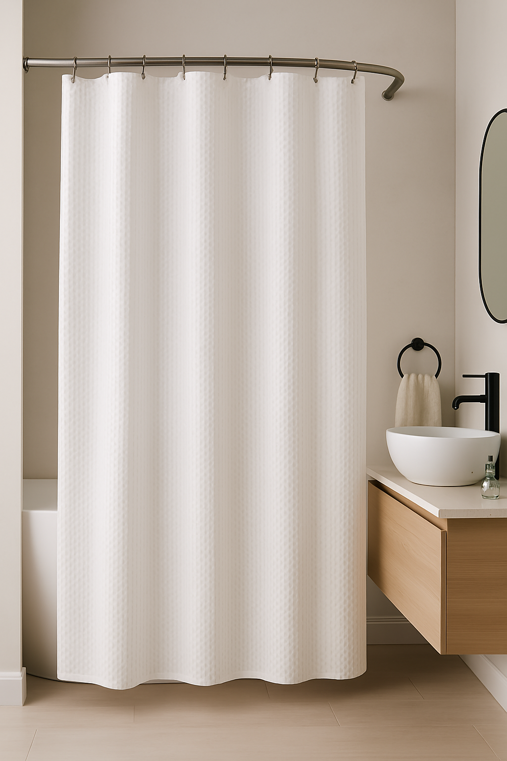 Un básico moderno para tu baño. Con diseño sutil en relieve tipo puntitos, esta cortina 100% poliéster aporta elegancia y simplicidad. Su caída fluida y su textura delicada suman un toque de frescura a cualquier estilo de decoración.