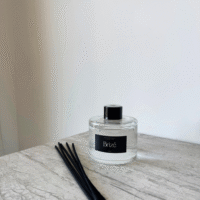 Difusor de varillas aromático. En envase de vidrio y varillas de rattan negras.